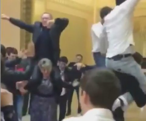 Дәу еркек әйелдің мойнына мініп билеп жүр!