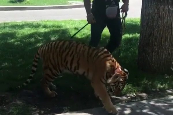 Алматыда талтүсте ер адам жолбарысты қыдыртып жүрген (видео)