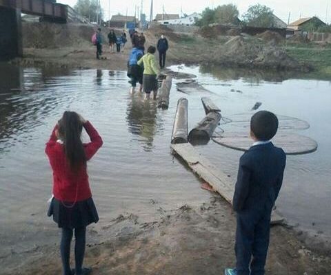 Атырауда ата-аналар жалаң аяқ су кешіп, балаларын арқалап жүр (фото)