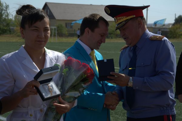 Эльмира Сыздықоваға Шет ауданында алтын сағат тағып, 500 мың теңге сыйға тарту етті